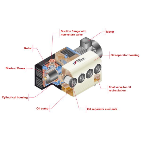 Common types of vane pumps include oil-sealed or dry-running pumps. Every rotary vane vacuum pump is based on the same standard components. Depending on the design, size or model, there will be variations in components.